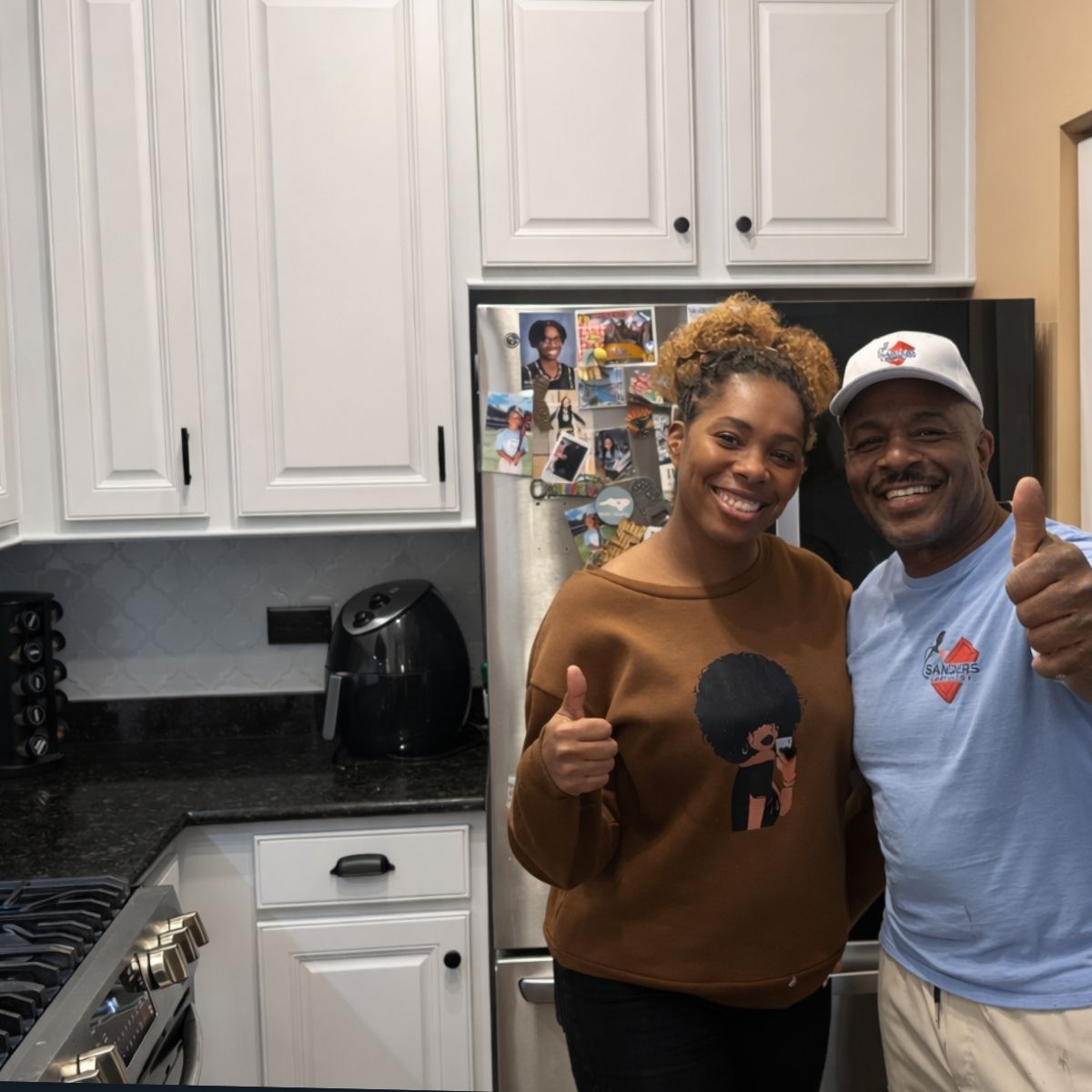 Ashley Barnes with Danny Sanders of Sanders Cabinetry, celebrating the finished kitchen.